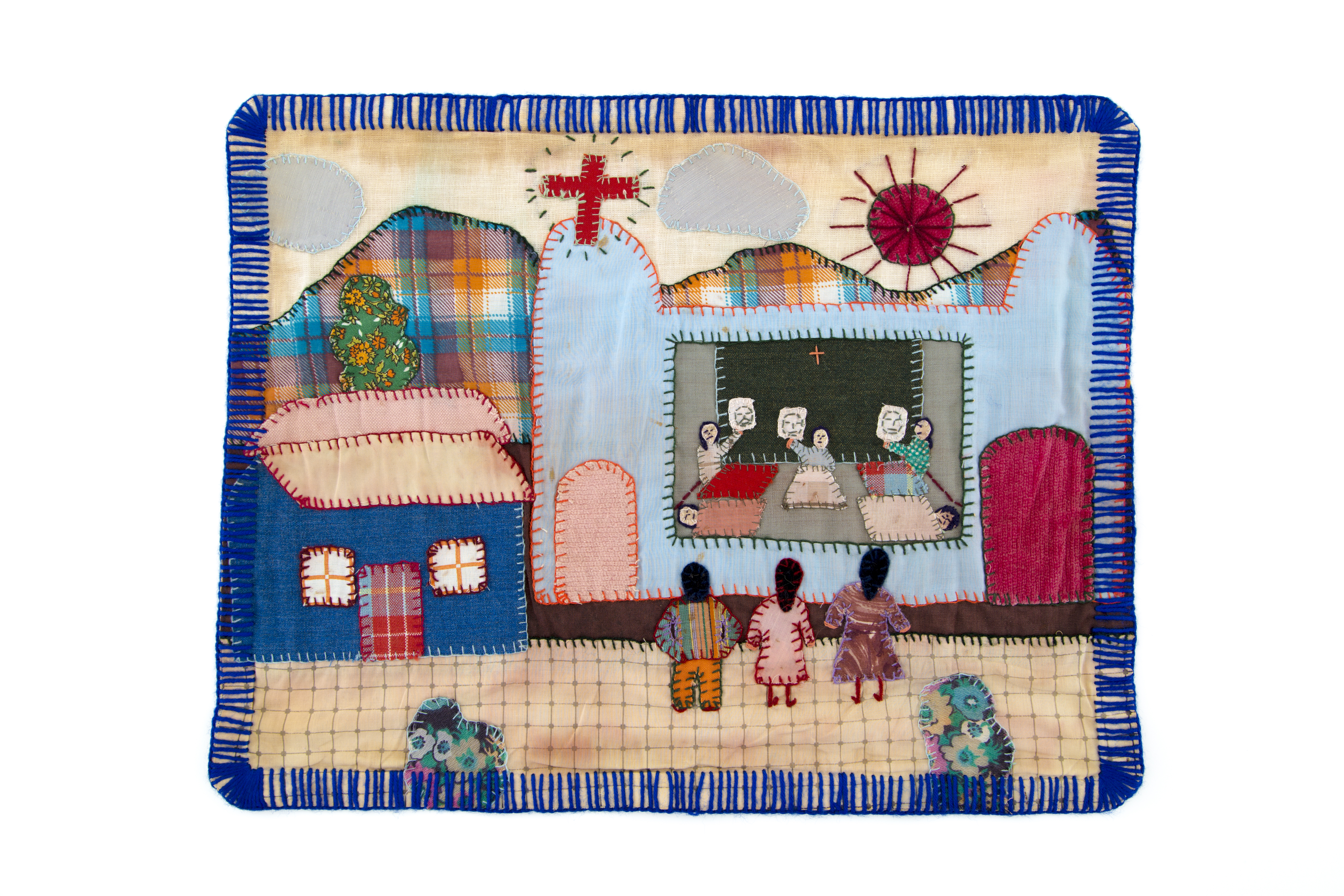 Arpillera que relata a un grupo de personas, entre familiares, religiosos, trabajadores, cesantes que se pliegan a la Huelga de Hambre de la Parroquia Jesús Obrero durante mayo y junio de 1978. La arpillera presenta mensaje "La incertidumbre de no sabe de su ser querido, obligo a buscar la verdad aun arriesgando sus vidas, cesantes, religiosos, trabajadores, etc... no se sintieron ajenos al problema y también se plegaron a la huelga aun arriesgando sus vidas. Este es el verdadero amor por el prójimo LA VERDAD NOS HARÁ LIBRE" La donante informa que la arpillera podría haber sido confeccionada como regalo por Ana Cáceres.
