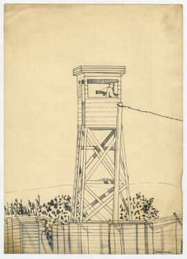 Dibujo realizado con lápiz grafito y lápiz pasta, que nos muestra una torre de vigilancia en el campamento de prisioneros de Puchuncaví.