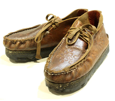 Zapatos de cuero confeccionados por Nelly Pinto contreras en el taller laboral de Tres Álamos, aquí funcionaba un grupo de mujeres prisioneras que hacían chalas, mocasines, carteras, chaucheras, cinturones y bolsos de viaje de cuero. Las integrantes del taller de cuero eran, Bernardita Montesinos, Nelly Pinto Contreras, Sheila Cassidy (inglesa), Alicia Alvarado Vistoso y María Isabel Matamala Vivaldi.