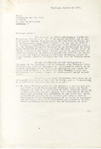 Documento dirigido al Señor Presidente del Pen Club de Chile, Antonio de Undurraga, a raíz de unas declaraciones efectuadas por el Vicepresidente de dicho Club, en las que desmiente las desapariciones de tres secuestros políticos.