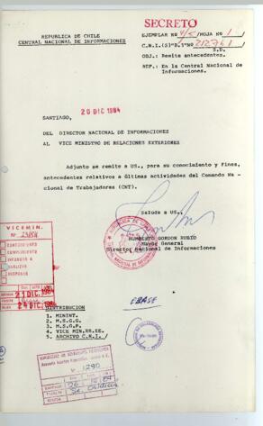 Director de la Central Nacional de Inteligencia al Vice Ministro de Relaciones Exteriores, remite memorandum con antecedentes sobre actividades realizadas por el Comando Nacional de Trabajadores (CNT).