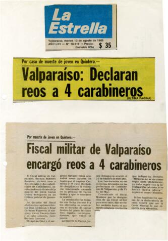 “Fiscal Militar de Valparaíso encargó reos a 4 Carabineros” sobre el procesamiento de 4 Carabineros involucrados en la muerte de Carlos Godoy Echegoyen, productos de torturas. Portada y noticia La Estrella 13 de agosto de 1985.