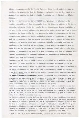 Alegato de Carmen Hertz en representación de Vasili Carrillo Nova, con el objetivo que confirme la resolución del Sr. Ministro Instructor que no dio a lugar la petición de nulidad, por todo lo formulado por el Ministerio Público Militar.
