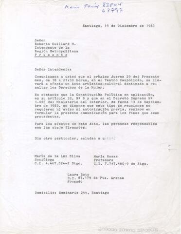 Carta al Intendente de la Región Metropolitana Roberto Guillard, informando sobre una actividad en el Teatro Caupolicán el día 18 de diciembre de 1983, se efectuará un acto artístico- cultural destinados a resaltar los Derechos de la Mujer.