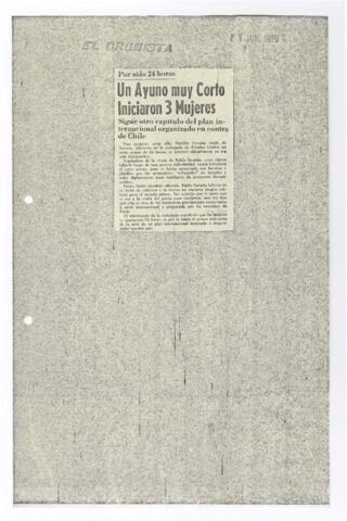 Compilación de prensa. Diarios El Cronista, El Mercurio, La Segunda, Ultimas Noticias, La Tercera, El País, con fecha 01 al 31 de junio. Tres mujeres entre ellas Matilde Urrutia, vuida de Neruda, iniciaron un ayudo de 24 hrs. en la Embajada de Estados Unidos. Ha esta iniciativa se adjuntan adhesiones y protestas de algunas organizaciones, como: "Movimiento apostólico niños y adolecentes", "Juventud Obrera Católica", "Servicio de Educación Popular", Y " Dindicato Industrial textil Internacional".