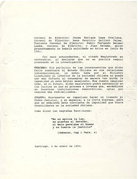 Documento del FASIC en el cual se denuncia publicamente, por un lado, la negativa a nombrar a un Ministro especial para investigar el asesinato de Carlos Prats y señora, y por otro lado, el reciente fallo en orden a confirmar el sobreseimiento definitivo, por aplicación de Ley de Amnistía, dictado por la Justicia Militar sobre el asesinato de Carmelo Soria. Sin firma.