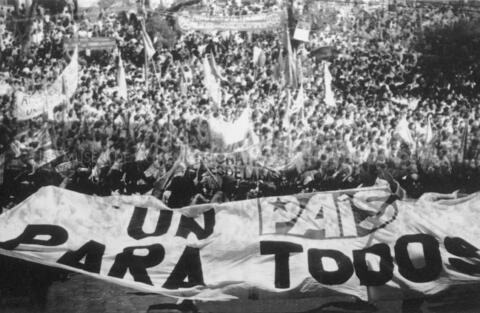 Fotografía donde se observa una manifestación y una bandera que dice “Por un País para todos”.