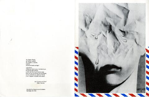 Tarjeta realizada por encargo de Comité Pro Retorno de Exiliados con imagen de obra realizado por Vásquez. En el reverso extracto del poema "Cuando de Chile" de Pablo Neruda. En el interior escrito en manuscrito que expresa el anhelo porque se acabe la separación obligada de familiares y por lograr la libertad, la justicia y la democracia.