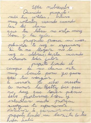 Carta de Lulú a José Alegría Godoy, por las cartas recibidas, las cuales la dejaron muy contentas al leer, además le pide a José que venga para su cumpleaños, si no llega, no lo va a celebrar...