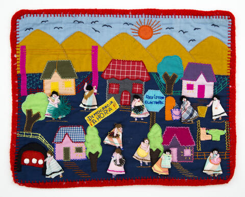 La arpillera muestra a un grupo de mujeres pobladoras realizando distintas actividades como pan, recolección de agua o limpieza. Además podemos apreciar un mensaje que dice "Democracia ahora"