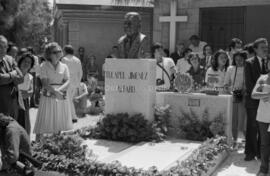 Fotografía donde se observa el funeral del sindicalista asesinado Tucapel Jiménez y miembros de la Asociación Nacional de Empleados Fiscales, ANEF, presentes en el Cementerio General.
